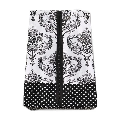 - This Bacati 4-piece Crib Set Includes Reversible Comforter/Playmat (33 x 43 inches), Crib fitted sheet (52 x 28 x 6 inches), Crib Skirt/Dust ruffle (13 inch drop) and Diaper Stacker (holds more than 30 newborn diapers) in fun, colorful and signature prints in 100 percent cotton 200 Thread Count percale fabrics. Designed in United States by Experienced Designers. Many coordinating items available to purchase separately in this Bacati Classic Damask Black/Grey/White Bedding Collection.