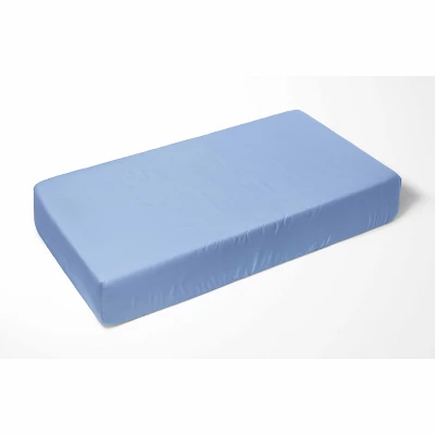 - This Bacati 10-piece Crib Set Includes Reversible Comforter/Playmat (33 x 43 inches), Crib fitted sheet (52 x 28 x 6 inches), Crib Skirt/Dust ruffle (13 inch drop) Diaper Stacker (holds more than 30 newborn diapers), Reversible Long Crib Rail Guard Cover (52 x 12 inches), Window Valance (15 h x 56 w inches with 1.75 inch Rod Pocket), 4 pc Wall Hangings Set and Musical Mobile in fun, colorful and signature prints in 100 percent cotton 200 Thread Count percale fabrics. Designed in United States by Experienced Designers. Many coordinating items available to purchase separately in this Bacati Mod Sports Blue Orange Chocolate Bedding Collection.