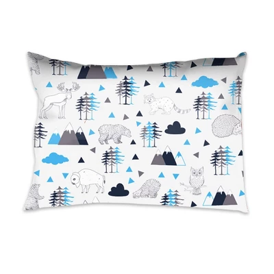 - This Bacati 4-piece Toddler Bedding Set Set Includes Reversible Oversize Comforter (42 x 55 inches), Toddler Bed Fitted Sheet(52 x 28 x 6 inches), Toddler Bed Flat Sheet(52 x 42 inches) which is fitted at the bottom to make the bed easily and Standard Pillow Case (20 x 25 inches) with french ties on the back in fun, colorful and signature prints in 100 percent cotton 200 Thread Count percale fabrics. Designed in United States by Experienced Designers. Many coordinating items available to purchase separately in this Bacati Woodlands Aqua Navy Gray Bedding Collection.