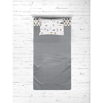 - This Bacati 4-piece Toddler Bedding Set Set Includes Reversible Oversize Comforter (42 x 55 inches), Toddler Bed Fitted Sheet(52 x 28 x 6 inches), Toddler Bed Flat Sheet(52 x 42 inches) which is fitted at the bottom to make the bed easily and Standard Pillow Case (20 x 25 inches) with french ties on the back in fun, colorful and signature prints in 100 percent cotton 200 Thread Count percale fabrics. Designed in United States by Experienced Designers. Many coordinating items available to purchase separately in this Bacati Woodlands Beige Gray Bedding Collection.