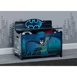 Turn any playroom into a super-cool Batcave with this Batman Deluxe Toy Box by Delta Children. Full of superhero style, this toy box features colorful graphics of Gotham City’s sworn protector, Batman. Constructed from durable wood, this sturdy storage piece is designed with rounded corners, smooth edges and a slow-closing lid for your little one’s safety.