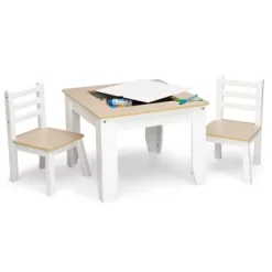 The Delta Children Chelsea Table and Chair Set provides a multi-functional area for endless hours of fun. Double-sided art surface features a dry erase board that flips into a chalkboard. Compartment for markers, paintbrushes, and more.