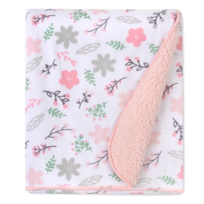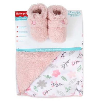 Sherpa lined floral print 30×35 inch blanket and matching plush booties non skid bottoms.