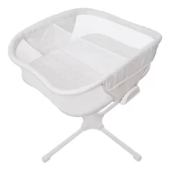 The HALO Bassinest twin sleeper is the only twin bassinet that rotates 360-degrees for the ultimate in convenience and safety. Now your little ones can sleep as close as you like, while still safely in their own separate sleep areas, reducing the risks associated with bed-sharing. Its unique design means your twins are visible at your eye level, allowing you to soothe your babies quickly. Mesh walls offer maximum breathability: they provide your twins with the togetherness they crave, and the safety of separate sleep spaces. In addition, its side walls lower and automatically return, allowing you to tend to your babies while still in bed, helping to make your recovery from childbirth a little easier. Its stable, adjustable base fits next to almost any bed. The HALO Bassinest twin sleeper includes a soothing center with 3 soothing sounds, 3 lullabies, nightlight, 2 levels of vibration and nursing timer.