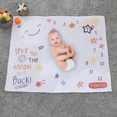 This blanket is designed to create the perfect photo opportunity and capture milestones for each month. Document baby’s progress as they grow! Features a smiling moon with shooting stars across puffy white clouds in soft gray, gold, orange and white with the saying, “Love you to the moon and back!”. Includes a gray star shaped felt cutout to place on each month. Made of soft plush fabrics and measures 40″ x 50″. Makes a wonderful keepsake gift!
