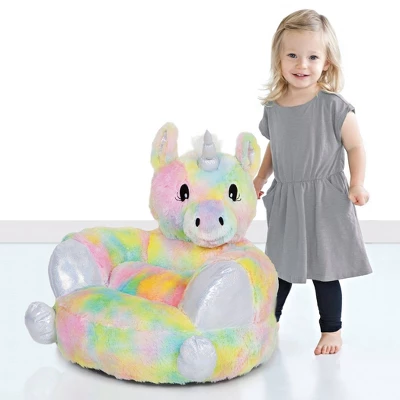The Trend Lab Children’s Plush Rainbow Unicorn Character Chair brings delightful whimsy to your little one’s world and to any room of the house. The Rainbow Unicorn Chair is a cuddly companion for reading, relaxing and snuggling thanks to its perfect size, soft plush “fur” and contoured support. The head is turned to the side to allow your child to rest easily against the animal for maximum cuddling comfort. The unicorn’s fur features soft rainbow tie-dye coloring and the feet, horn and inside of ears have a sparkly metallic finish. Chair measures 21 in x 19 in x 19 in and is suitable for most children. Please use parental caution and supervision. Chair is intended for children 12 months and older. For safe use, child must be able to sit unassisted and his/her feet should be able to touch the ground while sitting on the seat of the chair.