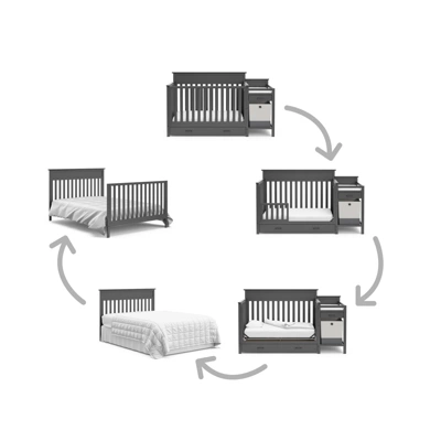 - 4-IN-1 CONVERTIBLE CRIB AND CHANGER: The Storkcraft Arizona Crib and Changer Converts from baby crib (mattress sold separately) to toddler bed (compatible with 1 or 2 toddler guardrails, each sold separately), daybed, and full-size bed (compatible full-size conversion kit sold separately)