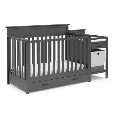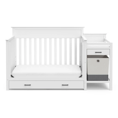 A feature-filled, all-in-one nursery solution – the Storkcraft Arizona 4-in-1 Convertible Crib and Changer combines timeless style, modern design, and touches of elevated designer details with the all-in-one convenience of an attached changing table, full-size drawer, and portable storage hamper. The Arizona Crib Convertible Crib and Changer’s attached changing table features a water-resistant baby changing pad, safety strap, a conveniently-sized additional storage drawer for quick access to nursery essentials, and two open shelves. The Arizona’s full-size under-crib storage drawer provides extra nursery storage, while the portable, standalone fabric hamper is perfect for storing laundry or toys.